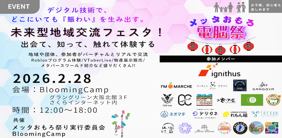 ・2026/2/28:昨年10月に開催し好評だったメタバース関連イベント「メッタおもろ電脳祭」の第2弾を、2月28日(土)大阪梅田のBlooming Campで開催します。弊社では、NECおよび各社と共に「関西地域共創プログラム」に参加しており、そのワーキンググループの実証実験として「Verifiable Credentials(検証可能な証明書、以下VC)」の配布を行います。 ぜひ特設ブースにお立ち寄りください。